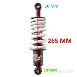 (R.24706) Vendo mono ammortizzatore usato marca Showa con molla bianca e interasse fori da 265 mm con foro occhiello superiore da 16 ed inferiore da 10 mm , per misure vedere foto
