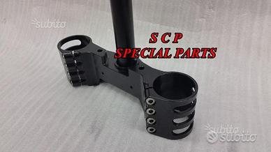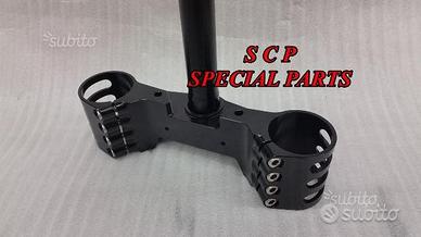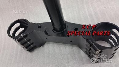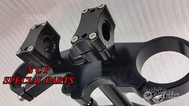 PRESENTIAMO PIASTRE DI STERZO RICAVATE DAL PIENO PER GUZZI 1200 SPORT Il kit piastre realizzato in ANTICORODAL è costituito da: piastra di sterzo inferiore con asse canotto e piastra di sterzo superiore completa di riser. Sovradimensionate con inferiore da 80 mm a 4 punti di chiusura con cave passanti. semimanubri o riser, disponibili su richiesta, regolabili in altezza e nel diametro manubrio. Su richiesta forniamo anche il kit OFF SET VARIABILE costituito da boccole eccentriche che ne permettono al modifica . Per il montaggio si utilizzano boccole e cuscinetti originali. Le piastre sono plug & play si montano senza modifiche sulla moto e sono realizzate per forcelle originali o speciali su richiesta . Possiamo realizzare cave di alleggerimento anche passanti e altre lavorazioni meccaniche su richiesta. Un prodotto rivoluzionario per efficacia, risorse tecniche e costo contenuto. Possibilità di scegliere qualsiasi colore per l'anodizzazione. Le piastre di sterzo sono progettate appositamente per migliorare il feeling con l'avantreno eliminando il chattering rendendo la moto piu' stabile e granitica in inserimento curva e percorrenza. La lega utilizzata è testata in pista nei principali campionati internazionali e studiata appositamente per assorbire le sollecitazioni e permettere alle sospensioni di lavorare molto meglio. Replichiamo attacchi e supporti originali per telaietto, quadro strumenti, blocco accensione, blocca sterzo, ammortizzatore di sterzo etc, se richiesto... oppure ne produciamo su specifica. Il cliente può scegliere qualsiasi tipologia, forma e lavorazione meccanica o estetica per il progetto delle piastre di sterzo entro i limiti imposti dalla quote della moto stessa, prendendo spunto dai nostri lavori precedentemente effettuati. Finitura superficiale e anodizzazione di qualsiai colore. PROTOTIPIAMO E RALIZZIAMO PIASTRE DI STERZO RICAVATE DAL PIENO PER QUALSIASI MOTO ANCHE REALIZZAZIONI SPECIAL
