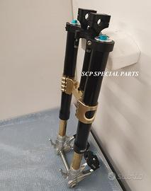 Progettiamo e Realizziamo avantreni speciali con forcelle ohlins e freni brembo, su misura per: special, superbike, harley, cafe racer, scrambler, custom, streetfighter, prototipi, showbike, maxi enduro, off road, maxi scooter. ESCLUSIVITA', PERFORMANCE, SICUREZZA ED ESTETICA AL TOP! PRESENTIAMO AVANTRENO SU MISURA PER GUZZI SPORT 1200 ( su richiesta anche per qualsiasi altro modello), costituito da: - FORCELLE OHLINS a stelo rovesciato, allestite su misura in base al progetto. Disponibili vari modelli :Ohlins NIX SUPERBIKE, Ohlins R&T oppure Ohlins a stelo tradizionale versione retrò. - PIEDINI FORCELLE RADIALI RICAVATI DA PIENO - KIT PIASTRE DI STERZO SU MISURA CNC RICAVATE DA PIENO, con attacchi originali - RISER CNC manubrio naked oppure COPPIA SEMIMANUBRI CNC - PINZE BREMBO RADIALI (vari mod. disp.) - STEFFE PARAFANGO RICAVATE DAL PIENO - PERNO RUOTA RICAVATO DA PIENO - PARAFANGO CARBONIO Optional: - COPPIA CERCHI RAGGI CNC - AMMORTIZZATORE POST. OHLINS - DISCHI E POMPE FRENO BREMBO IL KIT MONTA PLUG AND PLAY SENZA MODIFICHE POSSIAMO PRODURRE L'AVANTRENO PER MONTARLO CON IL CERCHIO ORIGINALE OPPURE PER CERCHIO SPECIALE. Piastre di sterzo speciali ricavate dal pieno con piastra inferiore da 80mm di spessore, alleggerita, a 8 punti di chiusura e piastra superiore con riser. Possiamo realizzare anche piastre ulteriormente maggiorate, fino a 95mm di spessore Per il montaggio delle piastre si utilizzano boccole e cuscinetti originali. Tutte le parti ricavate dal pieno possono essere anodizzate di qualsiasi colore. Le forcelle ohlins possono essere fornite con fodero anodizzato di qualsiasi colore. Possiamo progettare e realizzare qualsiasi modifica su richiesta. Sulle piastre possiamo replicare attacchi e supporti presenti sul modello originale per telaietto, quadro strumenti, blocco accensione, blocca sterzo, ammortizzatore di sterzo, fari, oppure possiamo realizzare attacchi e supporti speciali