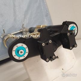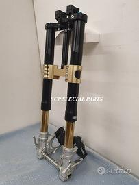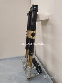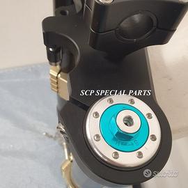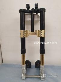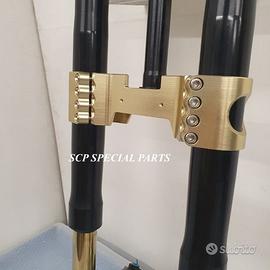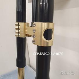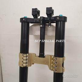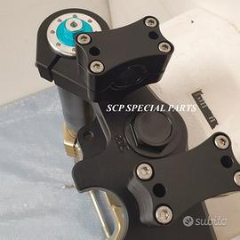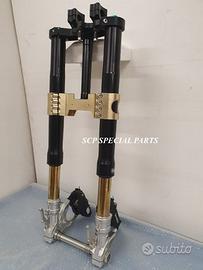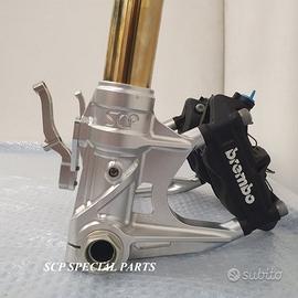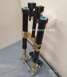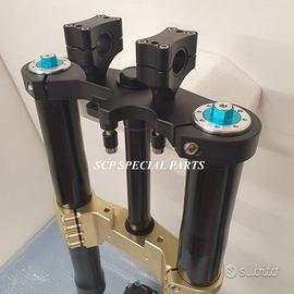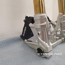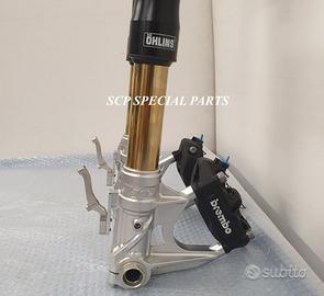 Progettiamo e Realizziamo avantreni speciali con forcelle ohlins e freni brembo, su misura per: special, superbike, harley, cafe racer, scrambler, custom, streetfighter, prototipi, showbike, maxi enduro, off road, maxi scooter. ESCLUSIVITA', PERFORMANCE, SICUREZZA ED ESTETICA AL TOP! PRESENTIAMO AVANTRENO SU MISURA PER GUZZI SPORT 1200 ( su richiesta anche per qualsiasi altro modello), costituito da: - FORCELLE OHLINS a stelo rovesciato, allestite su misura in base al progetto. Disponibili vari modelli :Ohlins NIX SUPERBIKE, Ohlins R&T oppure Ohlins a stelo tradizionale versione retrò. - PIEDINI FORCELLE RADIALI RICAVATI DA PIENO - KIT PIASTRE DI STERZO SU MISURA CNC RICAVATE DA PIENO, con attacchi originali - RISER CNC manubrio naked oppure COPPIA SEMIMANUBRI CNC - PINZE BREMBO RADIALI (vari mod. disp.) - STEFFE PARAFANGO RICAVATE DAL PIENO - PERNO RUOTA RICAVATO DA PIENO - PARAFANGO CARBONIO Optional: - COPPIA CERCHI RAGGI CNC - AMMORTIZZATORE POST. OHLINS - DISCHI E POMPE FRENO BREMBO IL KIT MONTA PLUG AND PLAY SENZA MODIFICHE POSSIAMO PRODURRE L'AVANTRENO PER MONTARLO CON IL CERCHIO ORIGINALE OPPURE PER CERCHIO SPECIALE. Piastre di sterzo speciali ricavate dal pieno con piastra inferiore da 80mm di spessore, alleggerita, a 8 punti di chiusura e piastra superiore con riser. Possiamo realizzare anche piastre ulteriormente maggiorate, fino a 95mm di spessore Per il montaggio delle piastre si utilizzano boccole e cuscinetti originali. Tutte le parti ricavate dal pieno possono essere anodizzate di qualsiasi colore. Le forcelle ohlins possono essere fornite con fodero anodizzato di qualsiasi colore. Possiamo progettare e realizzare qualsiasi modifica su richiesta. Sulle piastre possiamo replicare attacchi e supporti presenti sul modello originale per telaietto, quadro strumenti, blocco accensione, blocca sterzo, ammortizzatore di sterzo, fari, oppure possiamo realizzare attacchi e supporti speciali