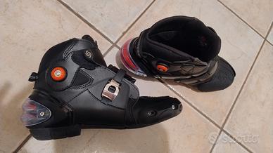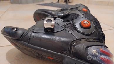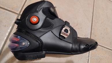 Stivaletti moto con protezioni scarponcini. Caviglia alta protettivi per motociclismo da turismo/pista più indicati per il turismo. Chiusura a cricchetto e velcro. Come si vede son ancora praticamente nuovi, son stati provati 2 turni in pista per abbandono attività sportiva, unico difetto una strisciata lieve sul sinistro come nel particolare in foto.prezzo (leggermente) trattabile.