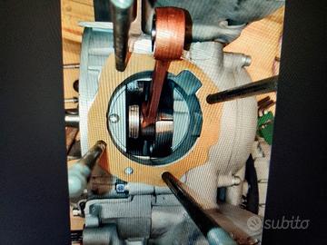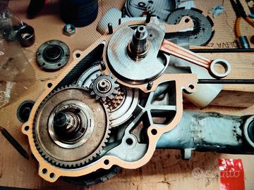 Cilindro rettificato e pistone nuovo, albero reimbiellato con biella originale, volano originale e bobina alta tensione nuova, revisionato parastrappi, frizione nuova, cuscinetti, gabbie a rulli, paraoli ecc