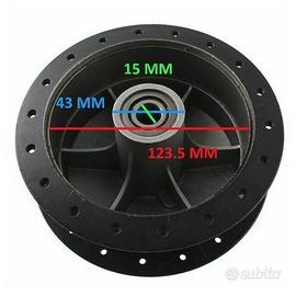 (R.12636) Vendo mozzo ruota anteriore da 36 fori nuovo per moto varie vintage 125 cc con codice Grimeca 95401 di colore nero con diametro interno 123.5 mm e leggeri segni di magazzinaggio , per misure vedere foto