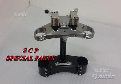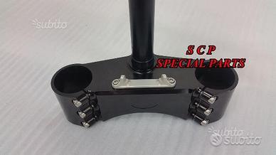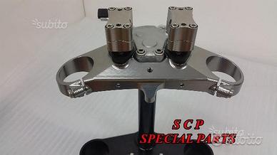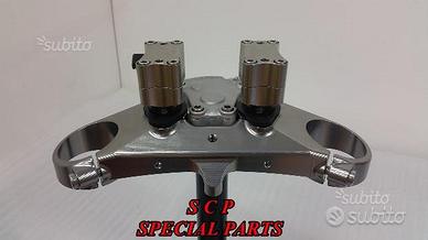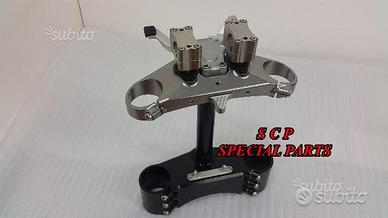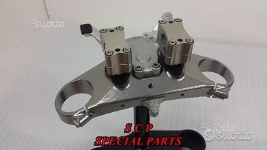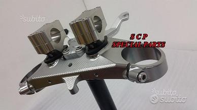 PROTOTIPIAMO E REALIZZIAMO PER TUTTE LE MOTO PIASTRE DI STERZO RICAVATE DAL PIENO, SIA PER REALIZZAZIONI STANDARD CHE PER APPLICAZIONI SPECIALI E REALIZZAZIONI SPECIAL PRESENTIAMO PER MV AGUSTA BRUTALE 1090 RR PIASTRE DI STERZO RICAVATE DAL PIENO PER MOTO STANDARD/ORIGINALE. Il kit piastre è costituito da piastra di sterzo inferiore con asse canotto e piastra di sterzo superiore. Riser removibili su silent block originali. Sovradimensionate con inferiore da 60 mm a 3 punti di chiusura oppure disponibile da 80 mm a 4 punti di chiusura. Su richiesta possiamo produrle anche a 5 punti di chiusura. Sono plug & play, si montano senza modifiche utilizzando boccole e cuscinetti originali. Possiamo realizzare cave di alleggerimento anche passanti e altre lavorazioni meccaniche su richiesta. Realizzate con Off set standard oppure speciale o regolabile a richiesta. Replichiamo tutti gli attacchi e supporti originali per telaietto, quadro strumenti, blocco accensione, blocca sterzo, ammortizzatore di sterzo etc... oppure ne produciamo su richiesta. Un prodotto rivoluzionario per efficacia e tecnologia impiegata. Possibilità di scegliere qualsiasi colore per l'anodizzazione. Le piastre di sterzo sono progettate appositamente per migliorare il feeling con l'avantreno eliminando il chattering rendendo la moto piu' stabile in inserimento curva e percorrenza e permettendo alle sospensioni di lavorare al meglio. Il cliente può scegliere qualsiasi tipologia, forma e lavorazione meccanica o estetica per il progetto delle piastre di sterzo entro i limiti imposti dalla quote della moto stessa, prendendo spunto dai nostri lavori precedentemente effettuati. Progettiamo e produciamo piastre anche per realizzazioni speciali e sostituzioni forcelle originali con altre aftermarket.