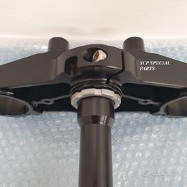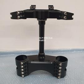 Il kit piastre realizzato in LEGA è costituito da: piastra di sterzo inferiore, completa di asse canotto e piastra di sterzo superiore con supporti manubrio.