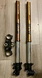 Nuovissima Forcella KYB ad escursione maggiorata 46 mm di diametro. Forcella per Tenere 700. Montata in origine sulla nuova World Raid 2026. Compatibile con tutte le T7 dal 2019 al 2026. Mostruoso miglioramento delle perfomance e della rigidità a meno della metà del prezzo di un kit Kayaba da 48 mm. Forcella nuova km zero smontata da moto destinata alle competizioni. Disponibile a parte piastre di sterzo con piastra superiore modificata Factory Yamaha per eliminare l’ammortizzatore di sterzo. Disponibile anche mono ammortizzatore posteriore ad escursione maggiorata + 8 mm. Componenti nuovi mai usati.