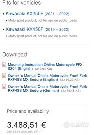Forcella ohlins RFX 48 per kawasaki kxf 250 450 dla 2019 in poi . Monta anche su modelli precedenti che montano focella showa da 48....io l.ho montata su un 2013... fornisco perno e cuscinetti mozzo per montarla proprio sulle annate precedenti al 2019.