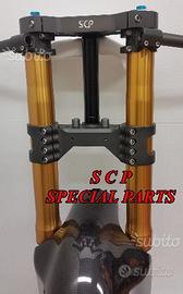 Kit costituito da: Forcelle OHLINS R&T 43 con stelo da 43 mm e fodero da 56mm, le forcelle sono modificate SPECIFICATAMENTE NELLA TARATURA per GUZZI GRISO. le forcelle sono corredate da piedini radiali e pinze BREMBO M4 radiali, piastre di sterzo speciali ricavate dal pieno e sovradimensionate con piastra inferiore da 80 mm a 4 punti con cave di alleggerimento passanti. Piastra di sterzo superiore alleggerita con cave passanti. Semimanubri ricavati dal pieno. Staffe parafango ricavate dal pieno con parafango in carbonio e kit perno ruota ricavato dal pieno. Per il montaggio si utilizzano boccole e cuscinetti originali. Il cerchio è Marchesini da 17 pollici con dischi brembo da 320mm. Possiamo progettare e realizzare qualsiasi specifica atta a rendere unica tale tipologia di prodotto. Tutte le parti ricavate dal pieno possono essere progettate e realizzate direttamente su specifiche tecniche ed estetiche del cliente. Sulle piastre possiamo replicare attacchi e supporti originali per telaietto, quadro strumenti, blocco accensione, blocca sterzo, ammortizzatore di sterzo etc oppure possiamo farne di nuovi su richiesta. Possiamo fornire come optional: cerchi a raggi su misura oppure forgiati a razze, cerchi Oz, Dymag, Pvm, dischi e pinze brembo, parafango carbonio, off set regolabile delle piastre. Progettiamo e Realizziamo avantreni per: cafe racer, scrambler, streetfighter, superbike, prototipi, show bike, maxi enduro, off road, special etc...