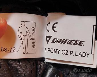 Pantaloni DAINESE PELLE PONY C2 LADY. Pantaloni in pelle sport touring taglio Lady. Caratteristiche tecniche ispirate direttamente ai modelli racing piu' spinti, ma taglio decisamente piu' morbido caratterizzano questo capo. Per chi vuole aggredire la strada in assoluta sicurezza, ma con un occhio anche alla sportivita'. Confezionati in pregiata pelle bovina Tutu con inserti in tessuto elastico sul cavallo, interno coscia e lato del polpaccio. I protettori, equivalenti a quelli dei modelli piu' racing, ne fanno un Pantaloni tecnico ma studiato appositamente per avere una eccellente vestibilita' e comodita'. L'ampiezza della vita e' regolabile e l'apposita cerniera permette l'aggancio di una giacca Dainese.