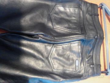 Vendo pantaloni in pelle nera da motociclista marca AXO foderati internamente in tessuto bordeaux .