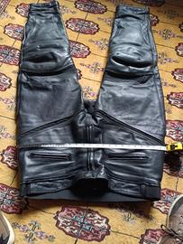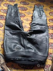 pantaloni in pelle ,condizioni buone no abrasioni ,tutte cerniere ok ,taglia indicativa 62 ,4xl,per altezza anche oltre 1.84 con molta pancia.fodera interna da cucire al cavallo,,pelle ottima di medio o più spessore, marca cafè Racer. disponibile a fornire misure dettagliate