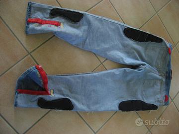 Pantaloni jeans da moto usati pochissimo marca Gialì J 2100 stone washed art.G1531. Con rinforzi termoformati lungo fianchi e ginocchia inseriti nel tessuto jeans - misto Kevlar (fibra aramidica) presenti a garantire una maggiore resistenza allo sfregamento. Predisposizione per inserire protezioni supplementari interne. Tessuto elasticizzato, chiusure a velcro posteriori per favorire la vestibilità e vita con inserto elastico posteriore. Tasche posteriori con chiusura di sicurezza tasche anteriori profonde e robuste. Riparano perfettamente dall'aria sulle ginocchia e forniscono ottima vestibilità in tutte le posizioni. Per la taglia posso fornire le seguenti dimensioni: semi circonferenza vita 47cm - lunghezza pantalone dalla vita 94cm.