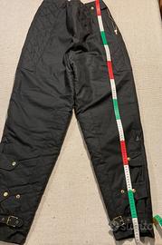 Pantaloni vintage moto imbottiti in cotone paraffinato, marca Frank Thomas serie Aqua, impermeabili, imbottiti, misura L, mai usati. Chiusura in vita con cerniera ed elastico. Chiusura caviglie con cinghie ed automatici. Colore nero.