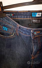 Vendo pantaloni da moto usati da mia moglie, in jeans tecnico CERTIFICATO con protezioni omologate sulle ginocchia (incluse) e rinforzi in Twaron nelle zone piu' esposte. Usati 4-5 volte; li vendo solo per cambio di misura, ma ho già preso altro paio sempre della PMJ.