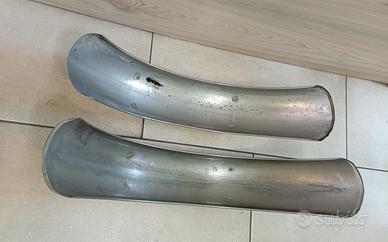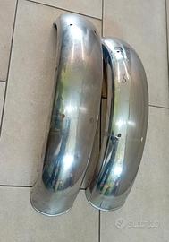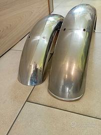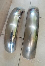 Parafanghi anteriori inox per Guzzi Idroconvert, T3, T3 California, G5, T, 850T. Usati, con normali segni di utilizzo, tipo qualche graffio o ammaccattura. Uno dei due, come da visibile, è stato accorciato per essere montato su un V7 Sport ed è praticamente un fac-simile di quello del V7 Sport, 750S S o S3. Venduti nello stato in cui si trovano.