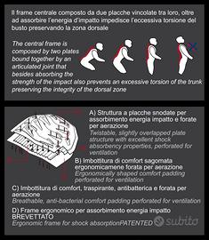 Il frame centrale composto da due placche vincolate tra loro, oltre ad assorbire l'energia di impatto, impedisce l'eccessiva torsione del busto preservando la zona dorsale.