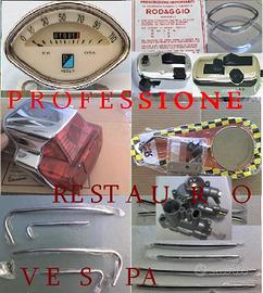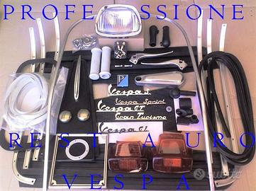 Pezzi di ricambio per il restauro della carrozzeria e motore adatti per - VESPA 150 GL ( VLA1T ) - 150 SPRINT ( VLB1T ) - 125 GT ( VNL1T - VNL2T ) kit ricambi 235 euro (FOTO 1 - 2 ): Manopole grigie Piaggio Faro ant. Ghiera faro cromata Leve a punta freno/friz. + 2 VITI Salvabordo in alluminio originale Coprimolleggio Cresta parafango Scritta ant. VESPAGT o VESPAS o VESPAGL Scritta post. VESPA GRAN TURISMO o VESPASPRINT Emblema Piaggio Gommini per: freno, pedivella, leva miscela, gommino raccordo tubo benzina e passacavi Scarpe cavalletto Guarnizione claxon Guarnizioni chiare dei cofani laterali Strisce pedane battitacco complete Tappetino centrale + coppia di listelli Tappeto grande pedane Plastica gemma stop 2 Tappi tamburo ruote Cornice targa cromata IL COSTO DI QUESTO KIT è 235 EURO A PARTE ALTRI ACCESSORI COI PREZZI DI FIANCO: E = EURO Serie guaine + fili nuovi E20 Filo conta/km + rocchetto ingranaggio E11 Conta chilometri E89 Sella ant. monoposto + cuscino post. E125 Piastra sotto sellino E34 Sella lunga in pelle Aquila o Piaggio E125; riprodotta E85 Impianto elettrico E33 Commutatore luci originali E24 Batteria GL E39 Cavalletto E18 Serratura bloccasterzo E10; serr. cofano E14 Cerchio E16 Modanature fregi cofani e paraf. (4pz) per Sprint granturismo E36; per GL E43 Adesivi rodaggio + mix 2% E9 Specchietto SX E18 Parafango gt, s E37 ; gl E89 3 Copertoni 3.50-10 neri E58; 3 spalla bianca E90 Ammortizzatore ant. E28; post. E35 Pedana in ferro E89 Scudo intero E179 Coppia Cofani laterali E209 Copriruota scorta E32 Stop completo eco E38; Originale Siem E95 Ganasce ant. E16; post. E10 Gruppo termico E145 Albero Motore E89 Guarniz. motore E7 Paraoli + OR E14 Claxon E32 Coprivolano Cromo E22 Ralle sterzo E25 Marmitta E56 Statore E89 Pedale freno E15 Gancio cofano E9 Forcella Completa E225 125gt granturismo 150sprint 150gl CONTRASSEGNO