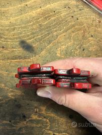 Vendo 4 pastiglie usate (2 coppie) brembo mescola rossa. Le pastiglie hanno percorso meno di 1500km, mai pista. Sono state smussate agli angoli come si vede in foto per diminuire rumori in frenata. Codice di riferimento 07BB3793 Montano su pinze brembo m4 ducati aprilia ecc.