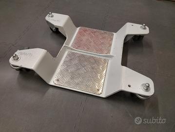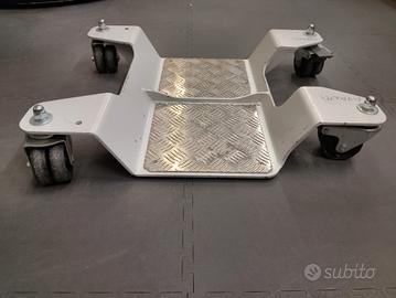 Realizzata in solido acciaio fe in spessore 6 mm, provvista di nervature di rinforzo per sostenere in sicurezza la tua moto, la pedana è dotata di quattro robuste ruote gemellate girevoli D75, di cui due con freno; il battistrada è in poliuretano per avere più grip su pavimenti lisci e assorbire meglio le piccole asperità dei pavimenti ruvidi. I pianetti di appoggio sono in duraturo alluminio mandorlato.