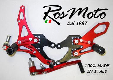 Coppia Pedane arretrate regolabili, disponibili per: Honda, Suzuki, Kawasaki, Yamaha, Ducati, Aprilia, Ricavate dal pieno da lastre di Ergal 7075 T6, Disegnate e Prodotte interamente in ITALIA. Anodizzate in diversi colori, prezzo a partire da 215,00 euro la coppia.