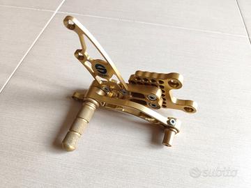Pedane racing per Honda CBR. Faccio notare che la pedana destra, lato freno posteriore, è leggermente grattata e il piolo della leva freno non è intero in quanto rotto in seguito ad una caduta della moto