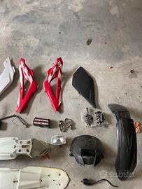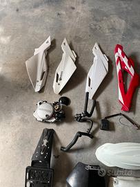 Parafango bianco acerbis: 10€ parafango beta nero: 5€ centralina valvola elettronica : 50€ tubi raduatore con termostatica: 15€ fianchetti bianchi 10 l'uno (tutti 25) convogliatori rossi con segni di usura: 20€ porta targa x 125: 10€ mascherina beta con faro:20€ paracolpi renthal: 10€ carter con pomap acqua: 30€ bobina husqvarna sm 125 kokusan: 25€ cambio sm: 50€ portalampada:10€ mascherina husqvarna:10€ pedane husqvarna sm 125: 5€ fianchetto sinistro nero beta: 10€