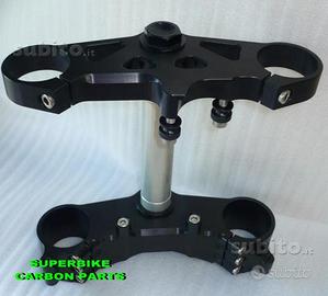 Produciamo piastre di sterzo speciali per qualsiasi moto, anche per prototipi o realizzazioni special. PRESENTIAMO PIASTRE DI STERZO SPECIALI CNC PER APRILIA RSV 1000 E TUONO. Il kit piastre è costituito da piastra di sterzo inferiore con asse canotto e piastra di sterzo superiore e predisposizione raiser manubrio per tuono. Per il montaggio si utilizzano boccole e cuscinetti originali. Possiamo realizzare cave di alleggerimento passanti sia sulla piastra di sterzo superiore che inferiore (ad esempio con asole passanti sul lato della piastre inferiore in modo tale da vedere sotto il fodero della forcella). Il kit piastre si monta sulle forcelle originali plug & play con la moto stradale senza alcuna modifica. Le piastre sono disponibili anche per forcelle ohlins o altra marca con kit di montaggio dedicato. Un prodotto rivoluzionario per efficacia, risorse tecniche e costo contenuto. Possibilità di scegliere qualsiasi colore per l'anodizzazione.Le piastre di sterzo sono progettate appositamente per migliorare il feeling con l'avantreno eliminando il chattering rendendo la moto piu' stabile in inserimento curva e percorrenza. La lega speciale utilizzata (testata in pista nei principali campionati internazionali e non come fanno quasi tutti gli altri produttori senza know how sui campi gara!!) E' studiata appositamente per assorbire le sollecitazioni e permettere alle spospensioni di lavorare molto meglio. Off set standard oppure speciale regolabile a richiesta.