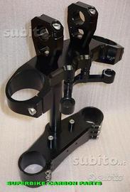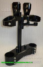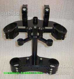 Produciamo piastre di sterzo speciali per qualsiasi moto, anche per prototipi o realizzazioni special. PRESENTIAMO PIASTRE DI STERZO SPECIALI CNC PER YAMAHA XJR 1200. Il kit piastre è costituito da piastra di sterzo inferiore con asse canotto e piastra di sterzo superiore e raiser manubrio. Staffe supporto strumentazione. Per il montaggio si utilizzano boccole e cuscinetti originali. Possiamo realizzare cave di alleggerimento passanti sia sulla piastra di sterzo superiore che inferiore (ad esempio con asole passanti sul lato della piastre inferiore in modo tale da vedere sotto il fodero della forcella). Il kit piastre si monta sulle forcelle originali plug & play con la moto stradale senza alcuna modifica. Le piastre sono disponibili anche per forcelle ohlins o altra marca con kit di montaggio dedicato. Un prodotto rivoluzionario per efficacia, risorse tecniche e costo contenuto. Possibilità di scegliere qualsiasi colore per l'anodizzazione.Le piastre di sterzo sono progettate appositamente per migliorare il feeling con l'avantreno eliminando il chattering rendendo la moto piu' stabile in inserimento curva e percorrenza. La lega speciale utilizzata (testata in pista nei principali campionati internazionali e non come fanno quasi tutti gli altri produttori senza know how sui campi gara!!) E' studiata appositamente per assorbire le sollecitazioni e permettere alle spospensioni di lavorare molto meglio. Off set standard oppure speciale regolabile a richiesta.