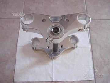 Vendo piastre di sterzo (superiore e inferiore) per custom, complete di boccole, canotto, ghiere, viti. Realizzate dal pieno, e lucidate. Marca " Paioli " Diametro fori per forcelle: 46 mm interasse fori: 214 mm. Mai usate.