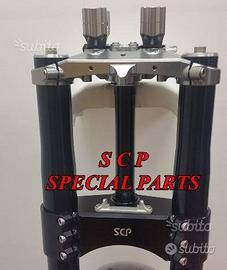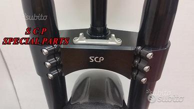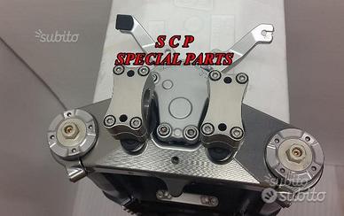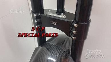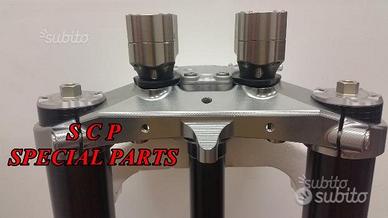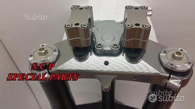 PROTOTIPIAMO E REALIZZIAMO PER TUTTE LE MOTO PIASTRE DI STERZO RICAVATE DAL PIENO, SIA PER REALIZZAZIONI STANDARD CHE PER APPLICAZIONI SPECIALI E REALIZZAZIONI SPECIAL PRESENTIAMO PER MV AGUSTA BRUTALE 1090 RR PIASTRE DI STERZO RICAVATE DAL PIENO PER MOTO STANDARD/ORIGINALE. Il kit piastre è costituito da piastra di sterzo inferiore con asse canotto e piastra di sterzo superiore. Riser removibili su silent block originali. Sovradimensionate con inferiore da 60 mm a 3 punti di chiusura oppure disponibile da 80 mm a 4 punti di chiusura. Su richiesta possiamo produrle anche a 5 punti di chiusura. Sono plug & play, si montano senza modifiche utilizzando boccole e cuscinetti originali. Possiamo realizzare cave di alleggerimento anche passanti e altre lavorazioni meccaniche su richiesta. Realizzate con Off set standard oppure speciale o regolabile a richiesta. Replichiamo tutti gli attacchi e supporti originali per telaietto, quadro strumenti, blocco accensione, blocca sterzo, ammortizzatore di sterzo etc... oppure ne produciamo su richiesta. Un prodotto rivoluzionario per efficacia e tecnologia impiegata. Possibilità di scegliere qualsiasi colore per l'anodizzazione. Le piastre di sterzo sono progettate appositamente per migliorare il feeling con l'avantreno eliminando il chattering rendendo la moto piu' stabile in inserimento curva e percorrenza e permettendo alle sospensioni di lavorare al meglio. Il cliente può scegliere qualsiasi tipologia, forma e lavorazione meccanica o estetica per il progetto delle piastre di sterzo entro i limiti imposti dalla quote della moto stessa, prendendo spunto dai nostri lavori precedentemente effettuati. Progettiamo e produciamo piastre anche per realizzazioni speciali e sostituzioni forcelle originali con altre aftermarket.