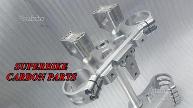 Il kit piastre è costituito da piastra di sterzo inferiore con asse canotto e piastra di sterzo superiore completa di riser. Sovradimensionate con inferiore da 80 mm a 4 punti di chiusura e cave di alleggerimento laterali passanti e superiore a 2 punti di chiusura con cava passante. Semimanubri racing ricavati dal pieno disponibili su richiesta . Per il montaggio si utilizzano boccole e cuscinetti originali. Sono plug & play, si montano senza modifiche. Possiamo realizzare cave di alleggerimento e altre lavorazioni meccaniche su richiesta. Un prodotto rivoluzionario per efficacia, risorse tecniche e costo contenuto. Possibilità di scegliere qualsiasi colore per l'anodizzazione. Le piastre di sterzo sono progettate appositamente per migliorare il feeling con l'avantreno eliminando il chattering rendendo la moto piu' stabile in inserimento curva e percorrenza. La lega speciale utilizzata è testata in pista nei principali campionati internazionali e studiata appositamente per assorbire le sollecitazioni e permettere alle sospensioni di lavorare molto meglio. Realizzate con Off set standard oppure speciale o regolabile a richiesta. Replichiamo attacchi e supporti originali per telaietto, quadro strumenti, blocco accensione, blocca sterzo, ammortizzatore di sterzo etc... oppure ne produciamo su richiesta. Il cliente può scegliere qualsiasi tipologia, forma e lavorazione meccanica o estetica per il progetto delle piastre di sterzo entro i limiti imposti dalla quote della moto stessa, prendendo spunto dai nostri lavori precedentemente effettuati. Finitura superficiale e anodizzazione di qualsiai colore. Progettiamo e produciamo piastre anche per realizzazioni speciali come per esempio la sostituzione forcelle originali con altre aftermarket o la modifica dell'impinato frenante da perimetrale a radiale.