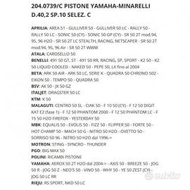 (R.13646) Vendo pistone nuovo con diametro 40.2 mm completo di fasce e spinotto da 10 x 33 mm con tolleranza B per motore Minarelli Orizzontale 50 cc - Aprilia SR - Area 51 - Gulliver - Rally - Sonic - Atala Carosello - VBenelli 491 - K2 - Pepe - Beta Ark - Quadra - Tempo - Italjet Dragster - KTM K - Malaguti Centro - Ciak - F10 - F12 Phantom - F15 Fire Fox - Yamaha Aerox - Neo's - MBK Nitro - Ovetto marca Polini con codice Polini 2040739B , per applicazioni vedere foto