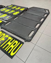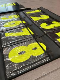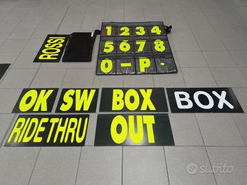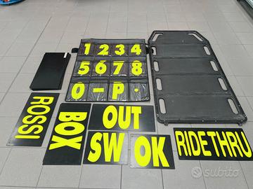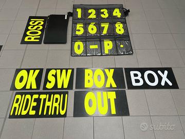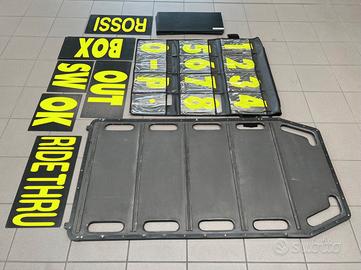 Pitboard / tabella segna tempi in carbonio per box Paddock. Possibilità di avere 4 file di informazioni con le cartelle dei numeri/simboli in carbonio (295x180 mm) e N.14 cartelle per nomi piloti in pvc (600x300 cm).