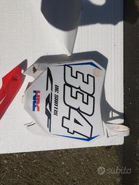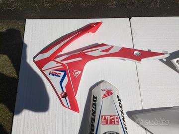 Vendo come da titolo plastiche Honda CRF 450 2013 - 2014 - 2015 - 2016 , montano anche su CRF 250 2013 - 2014 - 2015 - 2016 - 2017 . Si presentano in buone condizioni, mancano i fianchetti laterali , sulle tabelle c m è ancora la colla delle grafiche, un po di alcol e si rimuove, hanno qualche graffio dovuti all utilizzo, una tabella ha un buco formatosi per via della mancanza del nastro paracalore, per il resto niente danni che ne impediscano il montaggio, ottime come altro set di plastiche da usare in pista. Spedisco in tutta italia, pagamento Tuttosubito, Paypal o qualsivoglia tipo.