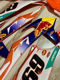 Plastiche ktm montano su 125, 250, 350, 450, 500, 2020-2023 enduro e cross da 2019-2022, é stata effettuata una riparazione sul fianchetto anteriore ma non interferisce con gli attacchi per ulteriori foto scrivetemi, ( c’ho anche il codino posteriore ho dimenticato di metterlo nella foto) preferisco ritiro a mano posso anche spostarmi in caso