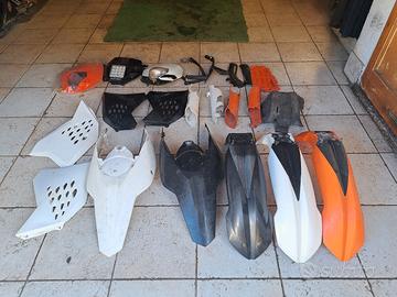 vendo plastiche usate x ktm 250 2008 in blocco 3 parafanghi anteriori 2 posteriori paramotore paramani proteggi telaio 2 mascherine con faro e una nuova senza faro coppri steli fiancatine tutto a 150 €