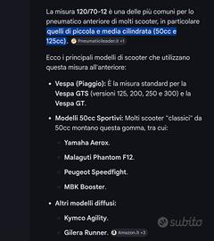 vendo pneumatico anteriore PREMIUM nuovo di zecca, ancora sigillato , per vespa GTS 125/150/200/250 marca PIRELLI DIABLO ROSSO (il migliore!!). Purtroppo l'ho appena acquistato per errore (al mio scooter monta il 15"). Monta anche su : Yamaha Aerox. Malaguti Phantom F12. Peugeot Speedfight. MBK Booster. Kymco Agility. Gilera Runner. Oltre a Piaggio Vespa GTS e GT pagato 60 euro