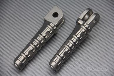 Coppia di poggiapiedi di tipo originale, in alluminio, con tutto il necessario per il montaggio come mostrato nella foto, rappresentativa del prodotto che riceverete.