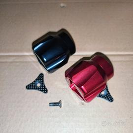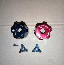 Pomelli registro precarico posteriore(mono ammortizzatore) Ducabike, in ergal anodizzato. Montano su mono ammortizzatore originale Ducati Multistrada 1200ABS/S model year 2010/2014. Condizioni pari al nuovo come da foto. Fornito con mascherina carbon look dedicata. Vendo anche singolarmente. Prezzo riferito a cadauno pomello.