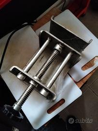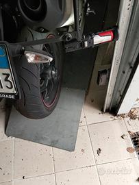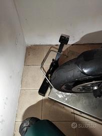 Vendo ponte idraulico con pompa di sollevamento manuale, a pedale, interamente in acciaio inox con morsa anteriore per blocco ruota. Ci sta comodamente la mia Triumph 1050 per essere chiari. lo vendo perché mai usato. Dimensioni 60cm x 173 cm - Altezza esteso circa 80 cm; altezza compresso 12 cm circa. Nelle foto è possibile vedere il ponte sotto la mia moto; l'ho usato solo per parcheggiare la moto. Davanti, dove c'è la ruota anteriore va montata la morsa in acciaio inox che si vede nell'ultima foto. Dietro al ponte c'è la pedana di salita che si può togliere al bisogno. Davanti si vede il "parapetto" di fermo moto e la pompa di azionamento della salita. Io purtroppo non ho posto per una adeguata sistemazione e uso del ponte.