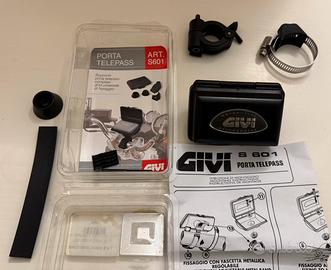 Custodia per dispositivi di pagamento del pedaggio autostradale del tipo "TELEPASS*" con kit universale per il fissaggio su manubri tubolari.