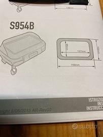Come nuovo, usato un paio di volte; dotato di supporto a manubrio che si adatta a tutti i diametri grazie ai suoi spessori in gomma; cinghietto di sicurezza che lega il portacellulare al manubrio; infine è compresa anche la sua cover anti-pioggia e il libretto di istruzioni e montaggio. Nella seconda foto sono riportate le dimensioni. Pagato 52 euro.