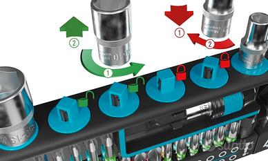 INNOVATIVO: conservazione stabile e facilmente accessibile degli utensili con funzione stand-up premendo il pulsante laterale - facile rimozione di tutti i pezzi, impossibile da far cadere".