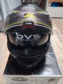 Nuovo come da negozio con tutto il corredo completo Devil è il Casco integrale per uso turistico, quindi pensato e progettato per le lunghe distanze, ma che si ispira nelle forme al mondo della pista. Ne nasce un prodotto adatto a chi desidera un casco adatto alle lunghe distanze senza rinunciare al design aerodinamico. In questo modello Premier ha voluto concentrare tutto il meglio delle conoscenze del suo reparto R&D Scheda tecnica: Sicurezza: Materiale: Fibra di carbonio e aramidicae resina epossidica Dimensione calotta esterna : 2 La calotta interna è pressostampata in EPS a densità differenziata a seconda delle zone Chiusura Cinturino: Micrometrico Omologazione: Ece 22.06 Peso : 1340 +/-50gr (calotta piccola) - 1380gr+/-50gr (calotta Grande) Visibilità: Visiera Trasparente Antigraffio predisposta per lente Pinlock con tasto di blocco centrale alla visiera per uan maggior sicurezza durante la guida Rimozione della visiera semplificata Visierino Solare a scomparsa Lente Pinlock Inclusa Interni: Tutti gli interni sono traspiranti e resi anallergici grazie al trattamento Sanitized e sono completamente sfoderabili e lavabili. E.R.S.= Emergency Release System - Sistema di rimozione rapida dei guanciali in caso di incidente Sistema di areazione con due prese d'aria frontali, una superiore e una sul mento, e un estrattore posteriore per un ricircolo d'aria costante. Eyes Easy Fit: Facilita l'igresso delle asticelle di occhiali da vista APD (Advance Padding System) : un comodo kit compreso nella confezione che consente di personalizzare la calzata ai massimi livelli. Predisposto per Sistema di comunicazione Bluetooth