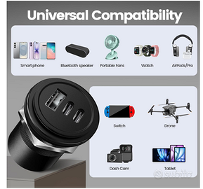 Presa USB 12V/24V Alluminio 68W - 3 Porte (2x USB-C + 1x USB-A) Vendo presa USB professionale da incasso, ideale per camper, van, barche, auto e camion. A differenza dei modelli economici in plastica, questa è realizzata completamente in alluminio, garantendo una dissipazione del calore superiore e una durata infinita. NUOVO adattabile anche per moto. Punti di Forza: Potenza Totale 68W: Carica velocemente fino a 3 dispositivi contemporaneamente senza cali di prestazione. Configurazione 3 Porte: USB-C (PD 3.0): 30W (ideale per tablet o piccoli laptop) USB-C (PD 3.0): 20W (perfetta per smartphone ultima generazione) USB-A (QC 3.0): 18W (per ricarica rapida standard) Design Minimalista: Una volta montata a incasso (foro 30mm), rimane a filo con la superficie. Nessun LED fastidioso durante la notte, ideale per la zona letto del camper. Qualità Premium: Corpo in alluminio ultra-resistente e sicuro contro i cortocircuiti e il surriscaldamento. Specifiche Tecniche: Compatibilità: Funziona su sistemi da 12V e 24V (Range DC 10-28V). Installazione: Facile montaggio a scomparsa con dado di fissaggio posteriore. Sicurezza: Protezione integrata contro sovraccarico e sovratensione. Condizioni: Il prodotto è nuovo, mai installato, ancora nella sua confezione originale. Perfetto per chi vuole aggiornare il proprio mezzo con una soluzione di ricarica potente ed esteticamente pulita.