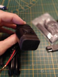 Presa USB doppia con interruttore per installazione su moto (o altrove), coperchio a tenuta stagna, protezione fusibile e agganci per montaggio.