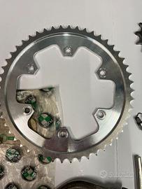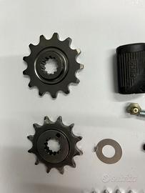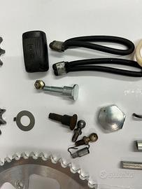 vari ricambi Puch MC 1971 corona ergal ricavata dal pieno come originale,pignone nuovo Z13 MC 73 ,pignone usato Z12 MC 71,leva cambio con gommino originale in acciaio,molla ritorno avviamento tappo forcella ceriani,colonnina fissaggio corona posteriore nuova,minuteria varia usata .