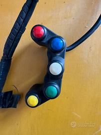 Vendo pulsantiera racing a 5 tasti specifica per Yamaha R6 (compatibile con vari anni, ideale per modelli dal 2006 in poi allestiti per uso pista/competizione). L’accessorio è indispensabile per chi vuole eliminare i blocchetti originali ingombranti e gestire le funzioni elettroniche in modo rapido e intuitivo durante la guida. Caratteristiche principali: • Configurazione: 5 pulsanti colorati (Rosso, Blu, Bianco, Verde, Giallo) per una facile distinzione visiva delle funzioni. • Design: Struttura ergonomica che si monta direttamente sulla pompa freno o sul semimanubrio. • Cablaggio: Già protetto con guaina telata e pronto al montaggio. Include terminale a occhiello (massa) e connettore faston. • Condizioni: Usata ma in ottime condizioni estetiche e funzionali, come da foto. Ideale per gestire mappature, TC (controllo trazione), limitatore pit-lane o cronometro. Prezzo trattabile