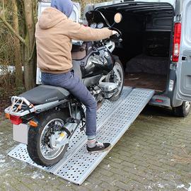 Rampa in alluminio con superficie anti sdrucciolo composta da 3 elementi pieghevoli in senso longitudinale per accompagnare la moto in fase di carico e scarico.