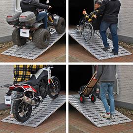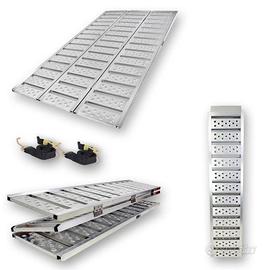 Questa rampa di carico portatile è un accessorio davvero pratico per chi deve spostare veicoli, offrendo una soluzione robusta e facile da usare. È realizzata in alluminio anodizzato, quindi non teme la ruggine e rimane leggera, pesando poco più di 20 kg. La sua superficie è antiscivolo per garantire un appoggio sicuro e si ripiega in tre parti, rendendola poco ingombrante quando non la usi.